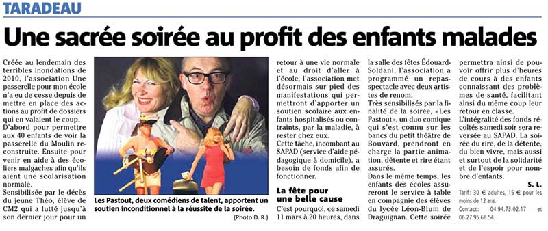 Initiée par l'association taradéenne "une passerelle pour mon école" la soirée de soutien au SAPAD était annoncée par la presse locale ici. A noter également un article fort synthétique de l'administratrice C. Morroni sur "Scolariser les enfants malades ou accidentés dans la cadre de l'APAD dans le cadre de l'APAD" ; elle a eu lieu avec succès comme le rapporte cet article de presse.