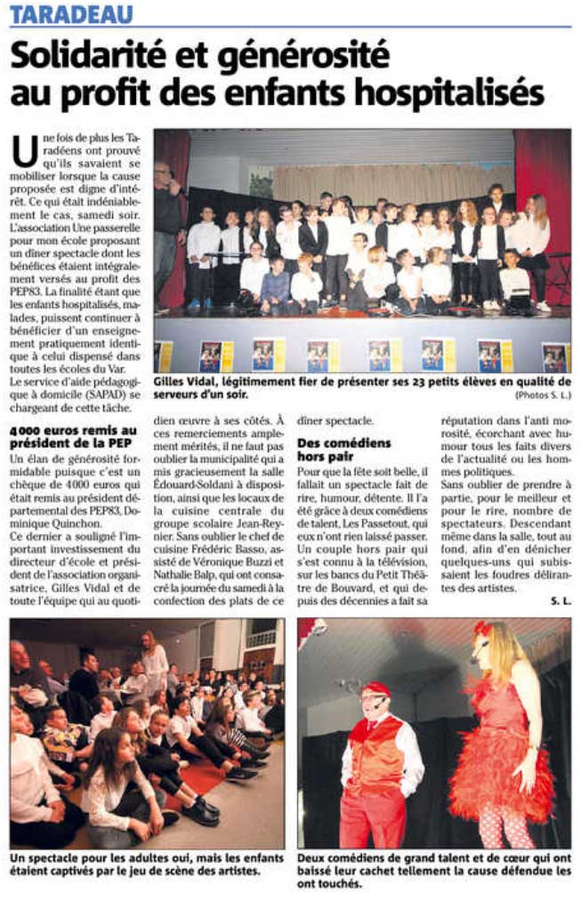 Soirée solidarité de Taradeau : ce 11 mars 2017 l'association taradéenne "Une passerelle pour mon école" réaffirme son engagement solidaire aurès des PEP83 et particulièrement du SAPAD ! Annoncée par la presse locale dans cet article, la manifestation est relatée dans cet autre, ainsi que sur cette page de notre site !