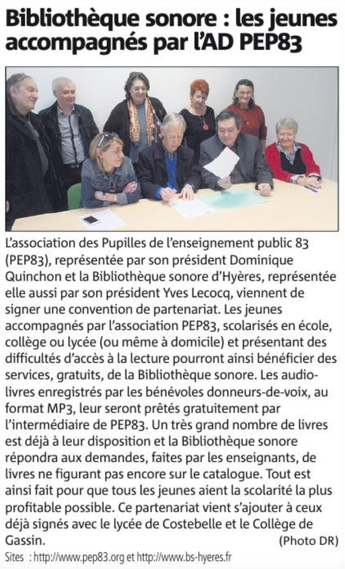 Convention avec la Bibliothèque sonore d'Hyères : signature relatée en local >>> et dans la presse régionale >>> ; mieux connaître cette structure par son bulletin >>>