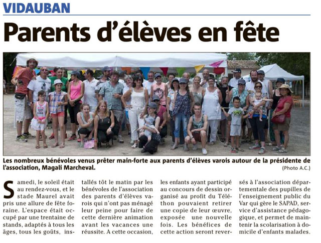 Ce sentiment de responsabilité vis à vis d’autrui anime d'autres structures qui ont fait du S.A.P.A.D l’objet de leur attention généreuse. Ainsi l’Association des Parents d’Elèves Varois organisait le 2 juillet 2016, à Vidauban sa kermesse annuelle.